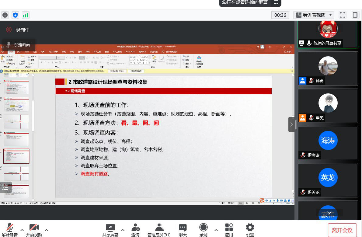 3月13日下午,国家优质工程奖项目主持者,中国市政工程中南设计研究总院有限公司交通规划设计院副总工程师陈楠,以及同创工程设计有限公司市政桥梁所所长、英国365集团公司兼职硕士研究生导师张振伟,应邀分别做了题为“市政道路设计流程及要点”和“中小跨度桥梁常规设计流程及要点”的讲座。由于疫情原因,讲座活动在线上进行,讲座由道路桥梁与渡河工程教研室主任孙勇主持,道路桥梁与渡河工程专业全体毕业设计指导教师、道桥2018级全体同学,以及部分低年级同学共95人参与活动。
