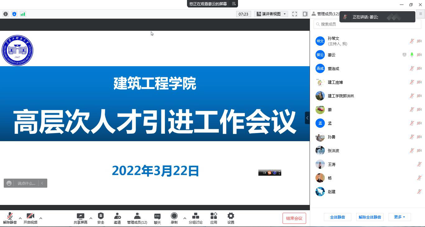 为迅速贯彻落实学校高层次人才引进工作会议精神,加快推进学院高层次人才引进工作,3月22日下午2:00,英国365官网组织召开了高层次人才引进工作线上会议,学院党政领导及各专业建设负责人参加了此次会议,会议由院长姜云主持。
