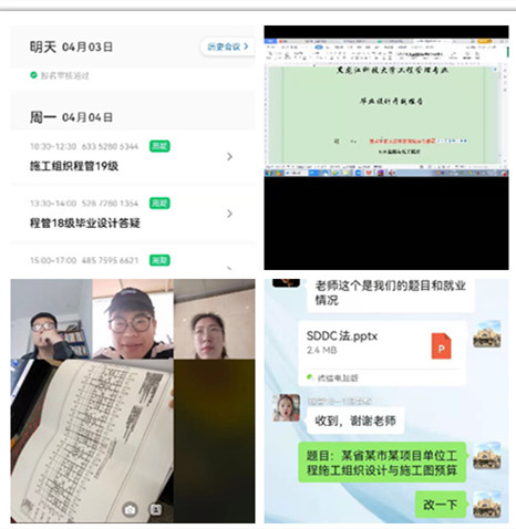 工程管理专业教师采用腾讯会议的方式指导学生进行毕业设计开题、图纸的检查、设计进度汇报等;利用钉钉、微信、QQ进行适时的设计指导;利用QQ的“远程操作功能”指导学生进行BIM模型的建立,通过实际操作的演示引导学生如何建模;使用“学习通平台”的在线学习功能,指导学生对于一些不明白的知识点,可以到已建立的云课程里进行复习;采用周例会制度,组织学生汇报一周的设计进展,指导教师进行点评,布置下周工作任务;同时安排答疑时间,及时为学生解决遇到的问题。