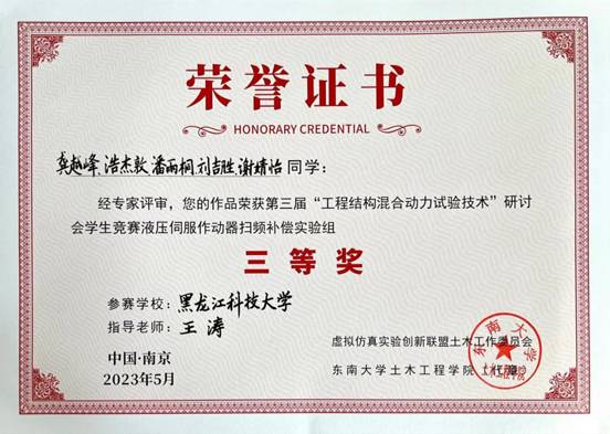 英国365集团公司王涛教授指导硕士研究生龚越峰、浩杰敦、潘雨桐、刘吉胜、谢婧怡在液压伺服作动器扫频补偿实验组竞赛。经过近两个月的精心筹备,我校参赛队伍在高手如云的队伍中脱颖而出,荣获三等奖。队员在学生竞赛中展示出缜密的学术思维、良好的理论功底和创新能力,得到了评委会专家的高度赞誉,大大提高了我校土木工程学科的学术声誉,也充分展示了我校研究生培养质量和教育教学水平。