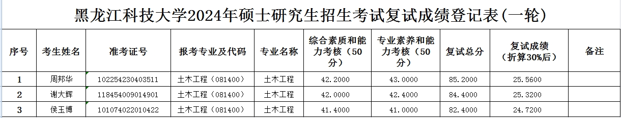 英国365集团公司2024年硕士研究生招生考试复试成绩登记表(一轮)土木水利