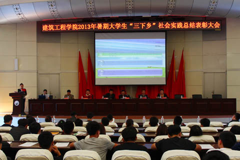 表彰大会在激昂的团歌声中拉开了帷幕。首先,在悠扬的音乐中全体参会人员一同观赏了暑期“三下乡”社会实践优秀作品展示,随后由姜海洋老师宣读了《关于表彰2013年暑期大学生“三下乡”社会实践活动先进集体、先进个人的决定》,“践行中国梦——走访萧红故居,弘扬黑土文化”等2个“三下乡”社会实践团、建筑学2012级2班等4个团支部、建筑学2012级2班陈光等17名团员青年荣获先进集体和先进个人,与会领导和老师为受表彰先进集体和先进个人代表颁奖,建筑学2011级1班纪明媚同学代表社会实践优秀团队做了题目为《走访新农村 建设新家园》获奖发言,土木2012级3班何元红同学代表社会实践优秀班级做了题目为《放飞理想 梦圆科大》获奖发言,建筑学2012级2班陈光同学代表社会实践获奖个人做了题目是《激昂青春 奋斗中国梦》的获奖发言。