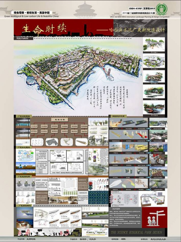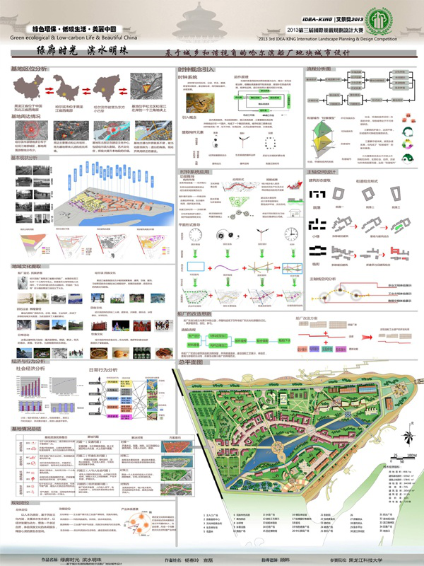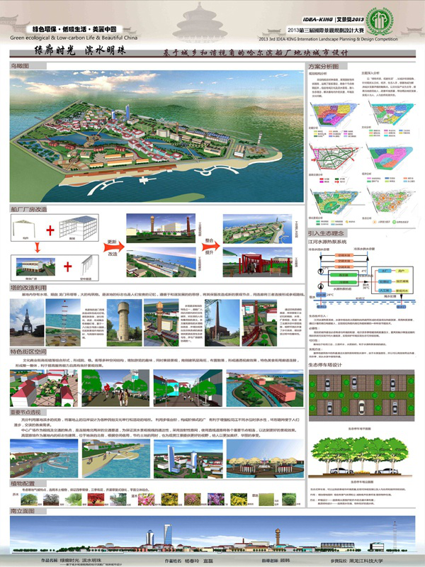 2013年3月18日至10月30日举行了2013年“艾景奖?第三届国际景观规划大赛”,该项赛事由国际园林景观规划设计行业协会(ILIA) 、 中国建设报社、北京林业大学教育基金会等共同主办。大赛以“绿色生态?低碳生活?美丽中国”为主题,内容涉及城市规划设计、旅游度假区规划、居住区环境设计等方面。本次大赛中,同济大学、东南大学、哈尔滨工业大学、华南理工大学、墨尔本皇家理工大学、韩国首尔大学等184所国内外高校、共计5618个组别参加了本次比赛。我校英国365集团公司城乡规划专业(原城市规划专业)的学生首次参加了此次比赛,在李冬梅、夏宏嘉等老师的指导下,我校4名学生凭借优秀的方案设计能力、过硬的图面表现能力及良好的心理素质,经过层层评选,激烈的竞争,最终获得骄人的战绩。黎洋佟、刘玉亭设计的“生命时续”——哈尔滨水泥厂更新改造设计,宣磊、杨春玲设计的“绿廊时光 滨水明珠——基于城乡和谐视角的哈尔滨船厂地块城市设计”均获得此次大赛城市规划设计组的银奖,开创了我校在此类国际大赛中获得优异成绩的先例。