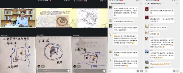 本次公开课教学过程中,庞博老师通过腾讯QQ软件中的家校群组织,实现定时组织学生签到打卡、重要内容公告提示、课后作业在线批改等组织工作。通过QQ群语音电话功能,实现PPT屏幕分享语音直播。运用手机端,通过QQ群视频功能,拍摄手写板书,实现教学重点及绘图部分实时共享。同时,运用第二手机端,通过加入教学过程,模拟学生端接收情况,以便于查看学生问题回答情况,并可及时发现如直播画面不清晰,字体大小等问题及时处理。选择中国大学MOOC中“古代文学作品中的城市”,由学生制作PPT,利用QQ群屏幕共享,进行翻转课堂的学习,其后教师进行点评。选择《中国古代都城研究》作为课程补充内容。由教师对MOOC视频进行预先筛选,在课程中指定部分慕课而非全部内容让学生进行观看学习。
