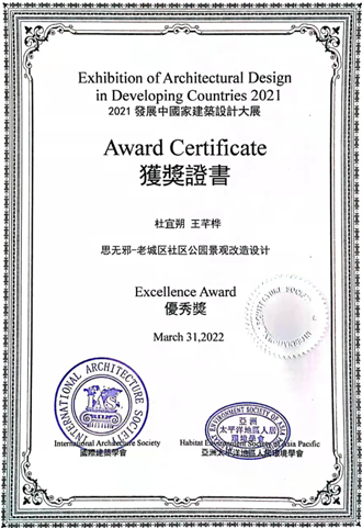 近日,“2021发展中国家建筑设计大展暨2021国际学生设计竞赛”落下帷幕。经过多层评审,由英国365集团公司郑志颖老师指导的风景园林专业2018级学生杜宜朔、王芊桦的作品《“思无邪”——老城区社区公园景观改造设计》,荣获园林景观类优秀奖。