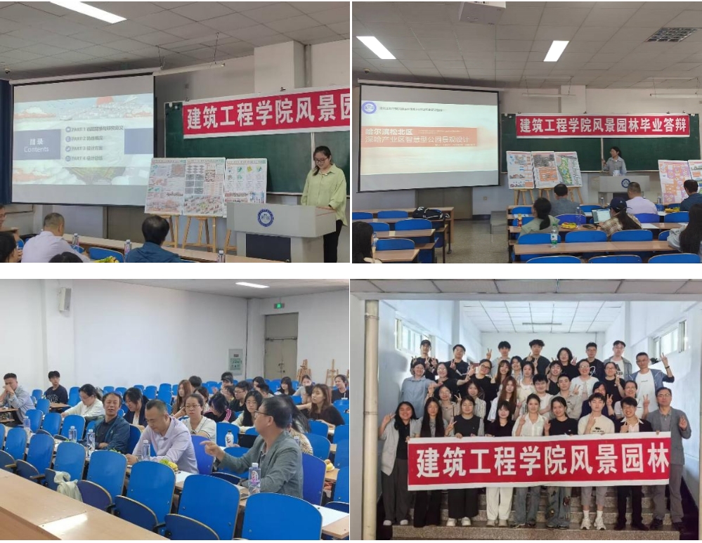 在公开答辩环节,任芳谊同学围绕“阜新市人民公园全龄友好型景观改造设计”展开汇报,深入剖析了如何通过景观设计满足不同年龄段人群的需求,打造温馨和谐的城市公共空间;王彤彤同学以“哈尔滨市松北区深哈产业区智慧型公园景观设计”为题,详细阐述了智慧科技与园林景观融合的创新思路,为新区城市公园的建设提供方向。两位同学的精彩展示,赢得了现场师生的热烈掌声,与会专家也对其设计成果进行了细致且专业的点评。公开答辩现场气氛热烈,全体专业教师以及风景园林、城乡规划和建筑学专业的部分同学积极参与,共同见证了这场学术盛宴。