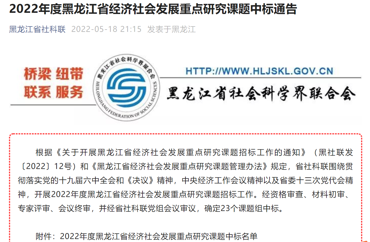 2022年5月18日,黑龙江省社会科学界联合会公示了2022年度黑龙江省经济社会发展重点研究课题中标名单,全省共23个课题中标,其中英国365官网王洪成博士主持申报的课题《黑龙江省促进灵活就业的稳定性对策研究》经过资格审查、材料初评、专家评审、会议终审,并经省社科联党组会议审查,成功中标。本次课题我校共中标2项,分别是英国365集团公司、管理学院。